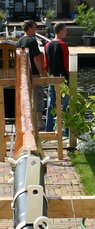 Het is Vrijdag 25 April dag 3, we gaan de mast lijmen de lijm die we gebruiken heeft een potlijf van ongeveer 2,5 tot 3 uur bij een temperatuur van 15 graden celcius, dus moet de mast met 3 uurtjes geklemd klaar liggen. Dus zijn we maar weer met 3 man aan de gang gegaan vandaag hielp de jongste telg uit de familie mee waardoor het mooi vlot ging. Alle zijden van het hout moeten mooi gelijkmatig worden in gesmeerd zodat er een goede verdeling van de lijm ontstaat